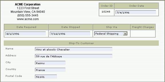 An example web page built with Iron Speed Designer. The application uses primary key relationships to retrieve the appropriate Order table record for editing. The application uses foreign key relationships to retrieve the associated Customer and Order Detail table records for editing. |