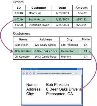 The URL contains the primary key value of a record in the database. Your application parses the URL parameter, extracts the primary key value, and performs the record lookup in the database. In this example, a query string called “ID” is used in the URL to convey a primary key value of “Bob Pinkston”. Bob Pinkston’s record is retrieved from the Customers table and displayed by a series of ASP.NET controls in the web page. |
