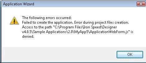 Create another folder for your application outside of the Program Files folder and use this new folder to create your application with Iron Speed Designer.