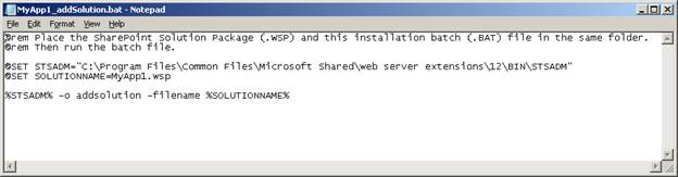 Step 4: Run the modified installation batch (.BAT) file in a command window from the same folder where the .WSP and the .BAT files are located. This adds the SharePoint Solution Package (.WSP) file to the SharePoint solution store.
