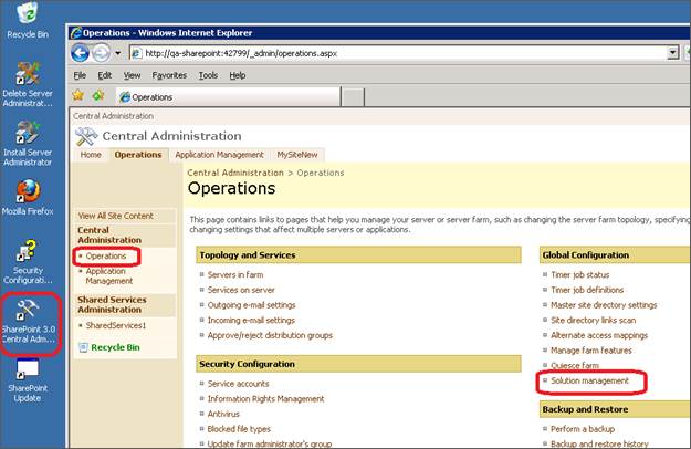 On the SharePoint server, double-click the SharePoint Central Administration utility. Click the Operations tab, and select Solution Management from the Global Configuration section. Then select the solution you want to deploy.