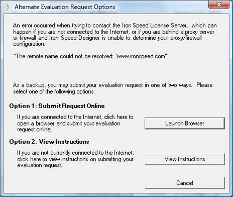 Step 1: When you complete the first section of the Activate Iron Speed Designer wizard and click the ‘Next>’button, Iron Speed Designer tries to contact the Iron Speed Activation Server across the Internet. If it is unable to gain access to the internet, an offline activation dialog is automatically displayed.