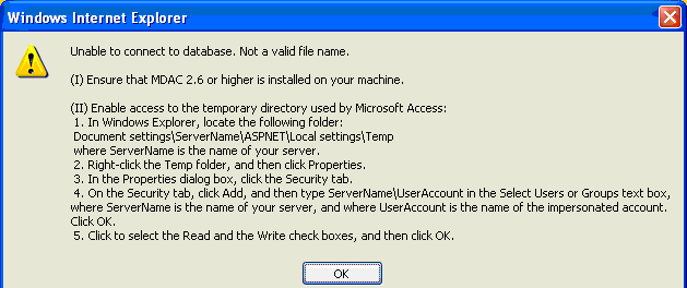 These errors typically occur when an incorrect Microsoft Access database file name is listed in the Data Source entry in your application’s Web.config file.