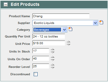 The Supplier and Category dropdown lists reference separate look up tables related to the Products table via foreign key relationships. |